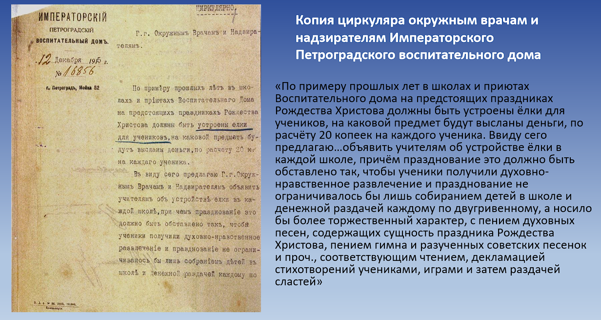 Для подопечных детей максимально создавали ощущение праздника. В 1915 году вышел отдельный циркуляр, предписывающий организовать ёлки в каждой школе и приюте при Воспитательном доме. Причем празднования должны были включать духовные песни, чтение стихотворений и игры. Позже, в Императорском училище глухонемых и Императорском женском педагогическом институте, устраивались театрализованные постановки и благотворительные балы. Праздники были красочными и веселыми, с масками и переодеванием в самодельные костюмы.
