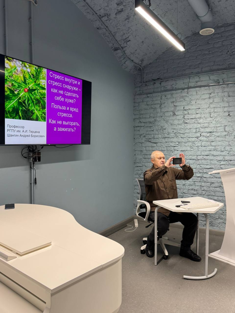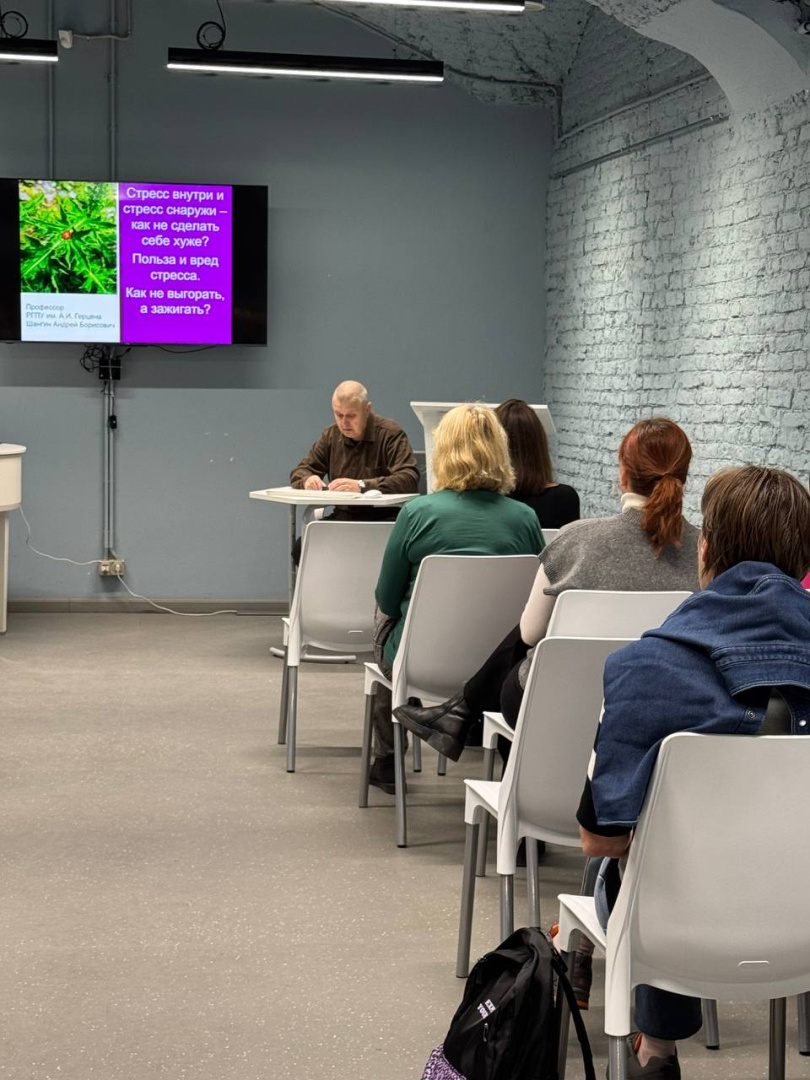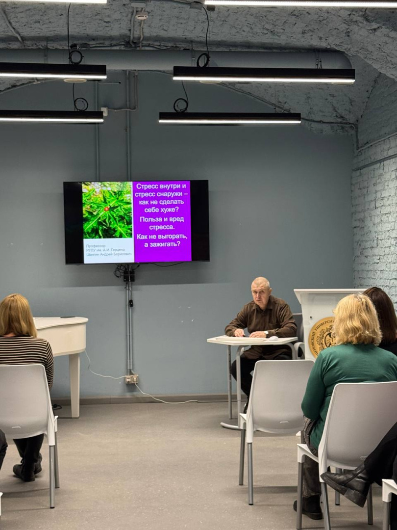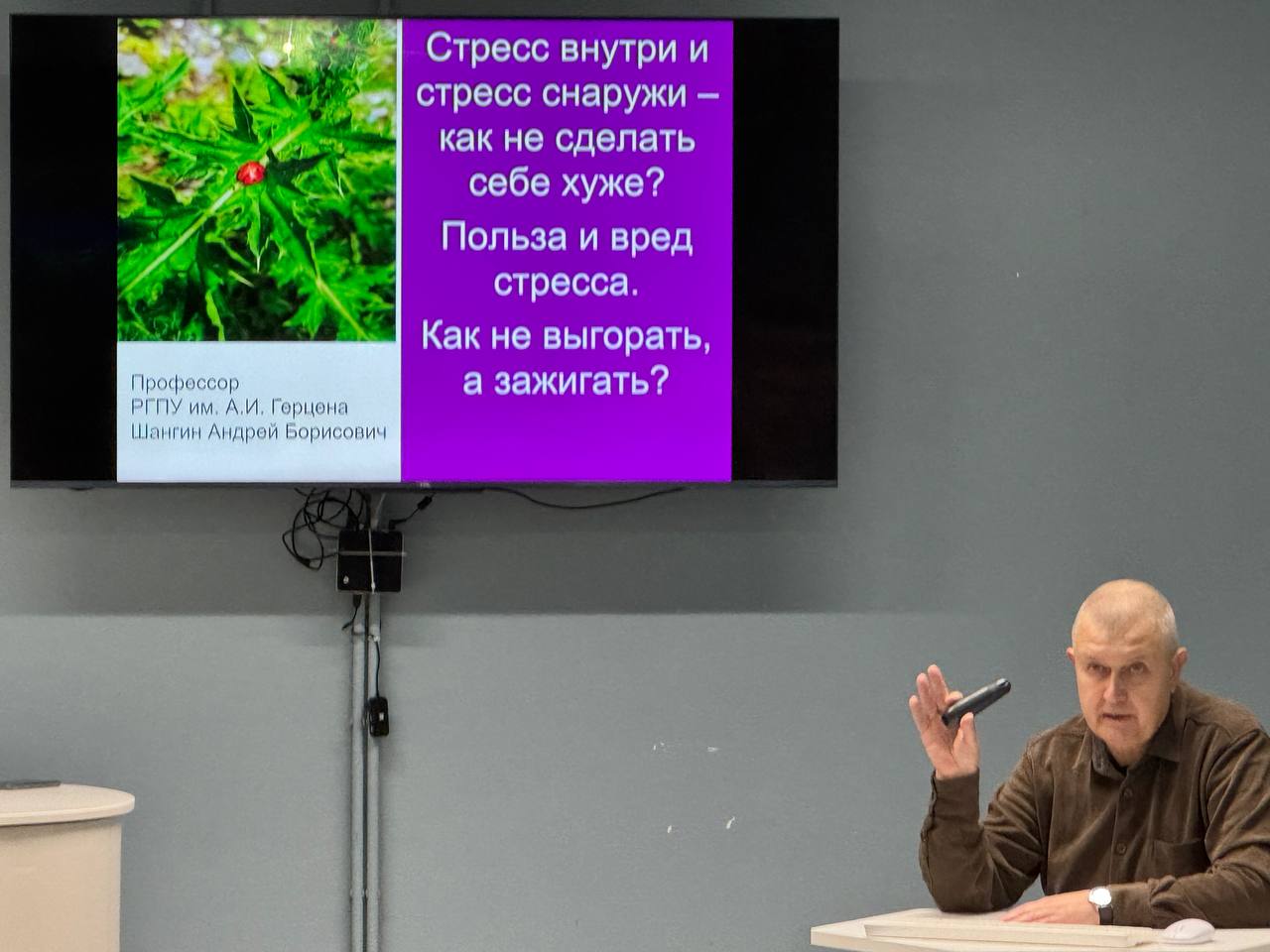 10 ноября в Открытом кампусе РГПУ им. А. И. Герцена состоялась открытая лекция профессора, доктора медицинских наук Андрея Борисовича Шангина «Стресс внутри и стресс снаружи: как не сделать себе хуже?». Встреча вызвала большой интерес: слушатели заполнили зал, чтобы разобраться, почему стресс сопровождает нас буквально с первых дней жизни — и как научиться использовать его силу, а не разрушаться под его давлением.
