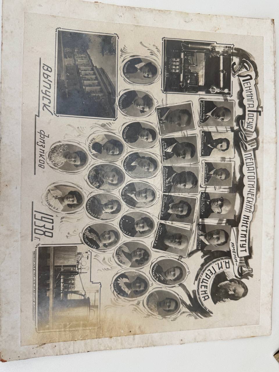 Жительница Петербурга передала в дар Музейно-просветительскому комплексу РГПУ им. Герцена фотографию выпуска физиков 1938 года. Как рассказала дарительница — Морозова Наталья Константиновна — фото она нашла случайно. Во время прогулки мимо старого нежилого дома, находящегося на реставрации, она заметила выброшенные фотографии, среди которых оказался и наш экспонат. Фотография стала дополнением новой большой выставки «От воспитательного дома к ведущему педагогическому университету России».
