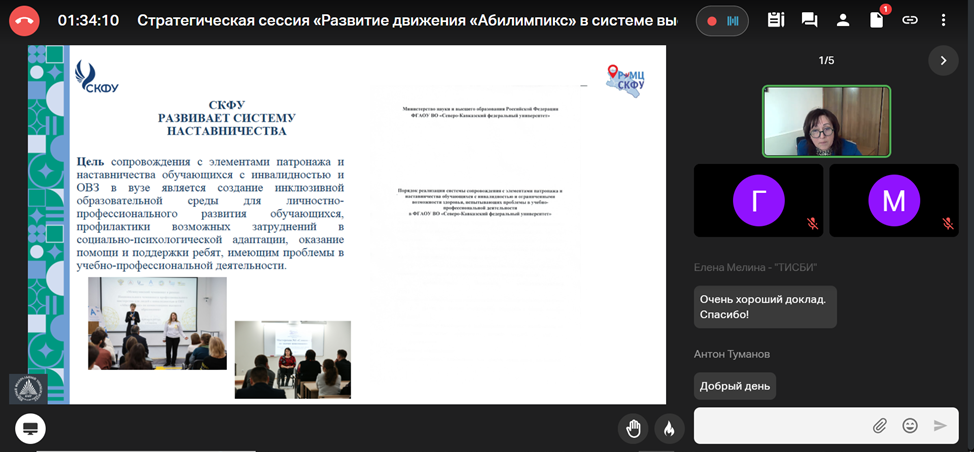 Ведущий специалист РУМЦ по обучению инвалидов и лиц с ОВЗ ФГАОУ ВО «Северо-Кавказский федеральный университет» Оксана Петровна Демиденко выступила с докладом «Наставничество в системе чемпионатов профессионального мастерства «Абилимпикс».