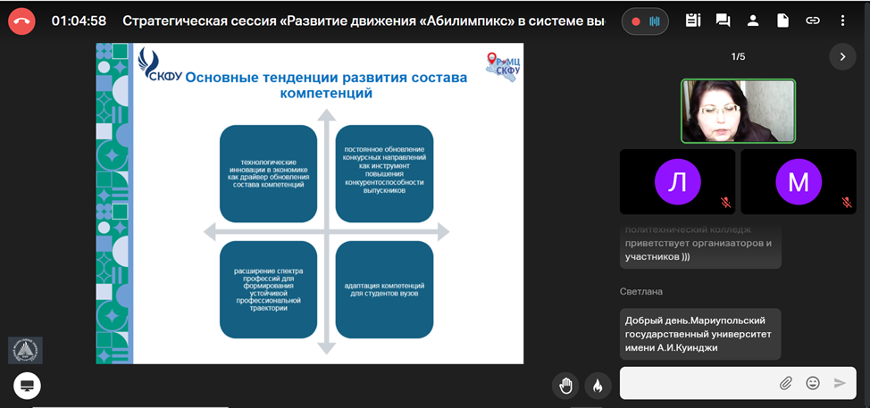 Главный специалист РУМЦ по обучению инвалидов и лиц с ОВЗ ФГАОУ ВО «Северо-Кавказский федеральный университет» Галина Юрьевна Козловская рассказала о развитии состава компетенций чемпионата «Абилимпикс» в контекста включения студентов с инвалидностью, получающих высшее образование.