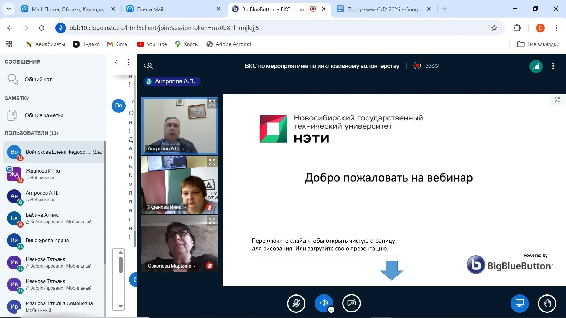 Директор РУМЦ А.П. Антропов и заместитель директора Е.Ф. Войлокова приняли участие в вебинаре, посвященном развитию волонтерского движения и организации мероприятий по инклюзивному волонтерству Всероссийской сети РУМЦ ВО. В мероприятии приняли участие директор координационного центра инклюзивного высшего образования М.Б. Соколова, директор РУМЦ НГТУ И.В. Жданова, руководители и специалисты РУМЦ МГППУ, РУМЦ НГПУ им. К. Минина.