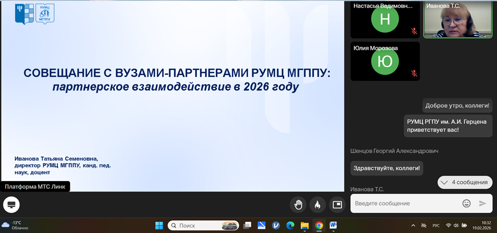 В смешанном формате совещания участвовали представители более 20 вузов – партнёров РУМЦ РГПУ им.А.И. Герцена: СЗФ РГУП им. В.М. Лебедева, СПб ПУ Петра Великого, СПб ГУПТД, СПГХПА им. А.Л. Штиглица, ИТМО, СПбГУ, ВШЭ, СПбГУАП, СПбГЭТУ «ЛЭТИ», СПбГЭУ и другие вузы-партнёры.