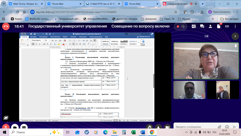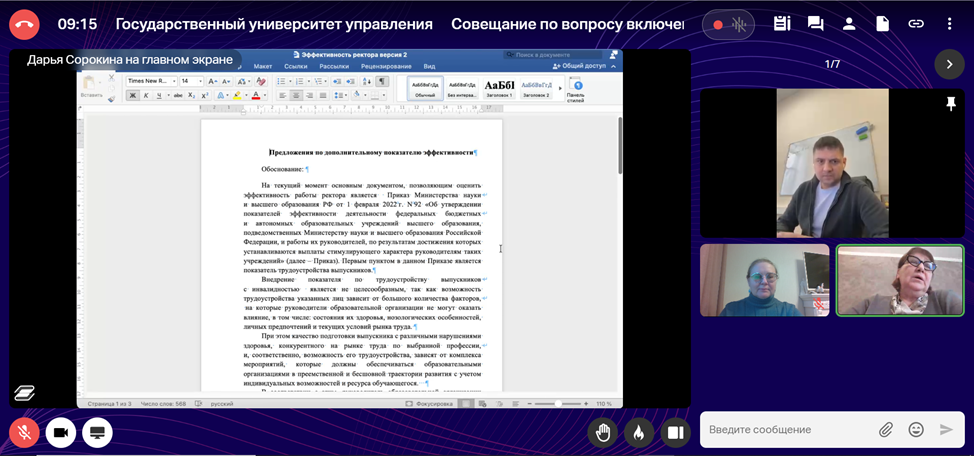 На текущий момент основным документом, позволяющим оценить эффективность работы ректора является Приказ Министерства науки и высшего образования РФ от 1 февраля 2022 г. N 92 «Об утверждении показателей эффективности деятельности федеральных бюджетных и автономных образовательных учреждений высшего образования, подведомственных Министерству науки и высшего образования Российской Федерации, и работы их руководителей, по результатам достижения которых устанавливаются выплаты стимулирующего характера руководителям таких учреждений» (далее – Приказ). Первым пунктом в данном Приказе является показатель трудоустройства выпускников. В ходе совещания обсуждалась возможность дополнить Приказ показателем, позволяющим оценить эффективность процесса сопровождения трудоустройства выпускников с инвалидностью и ОВЗ, который может быть рассчитан на основании Критериев оценки инклюзивной образовательной организации в сфере высшего образования.