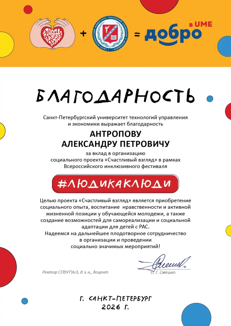 В адрес директора РУМЦ поступила благодарность от ректора Санкт-Петербургского университета технологий управления и экономики Олега Григорьевича Смешко.