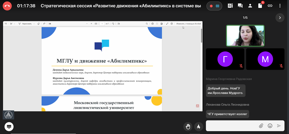 Заместитель директора РУМЦ РГПУ им. А.И. Герцена Е.Ф. Войлокова, специалист по учебно-методической работе И.Ф. Касацкая приняли участие в онлайн Стратегической сессии: «Развитие движения «Абилимпикс» в системе высшего образования».