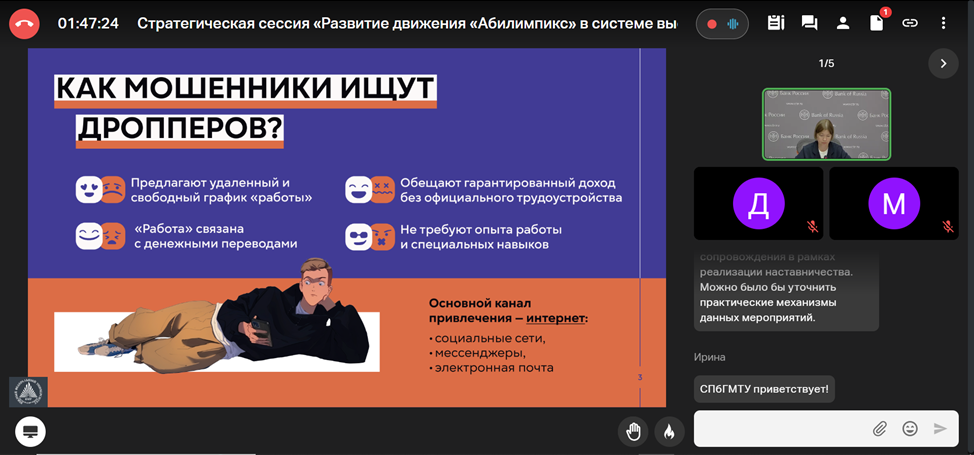 Заместитель директора РУМЦ РГПУ им. А. И. Герцена Е. Ф. Войлокова и представитель вуза – партнера Герценовского университета по линии РУМЦ Н. В. Мюллер приняли участие в онлайн-совещании, посвященном проведению Чемпионата Абилимпикс в 2025 году.