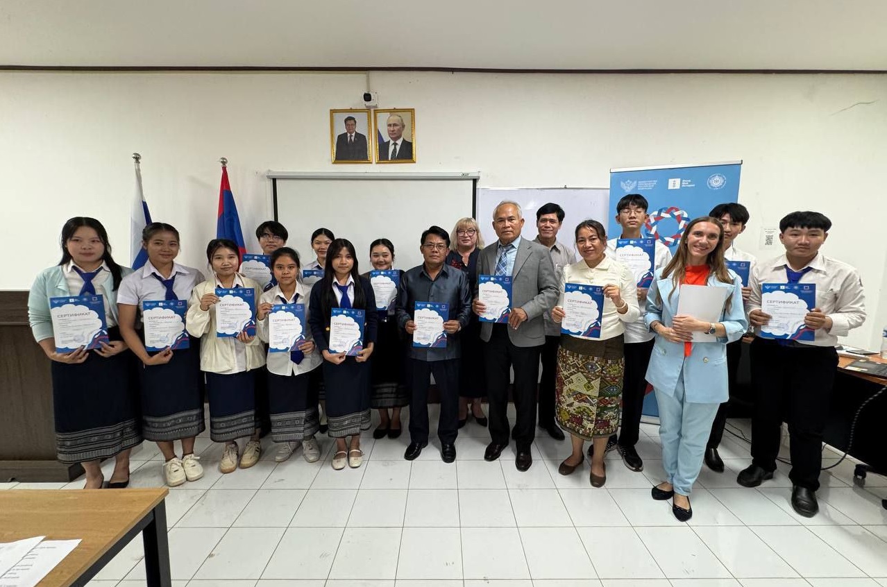 Вручение сертификатов об окончании курсов по русскому языку состоялось в центре открытого образования на русском языке и обучения русскому языку в Национальном университете Лаоса. Слушатели курсов сказали много добрых слов и пожеланий преподавателям института русского языка как иностранного РГПУ им. А. И. Герцена Марине Олейник и Юлии Карпеченковой, которые на протяжении семи недель погружали их в прекрасный мир русского языка и русской культуры.