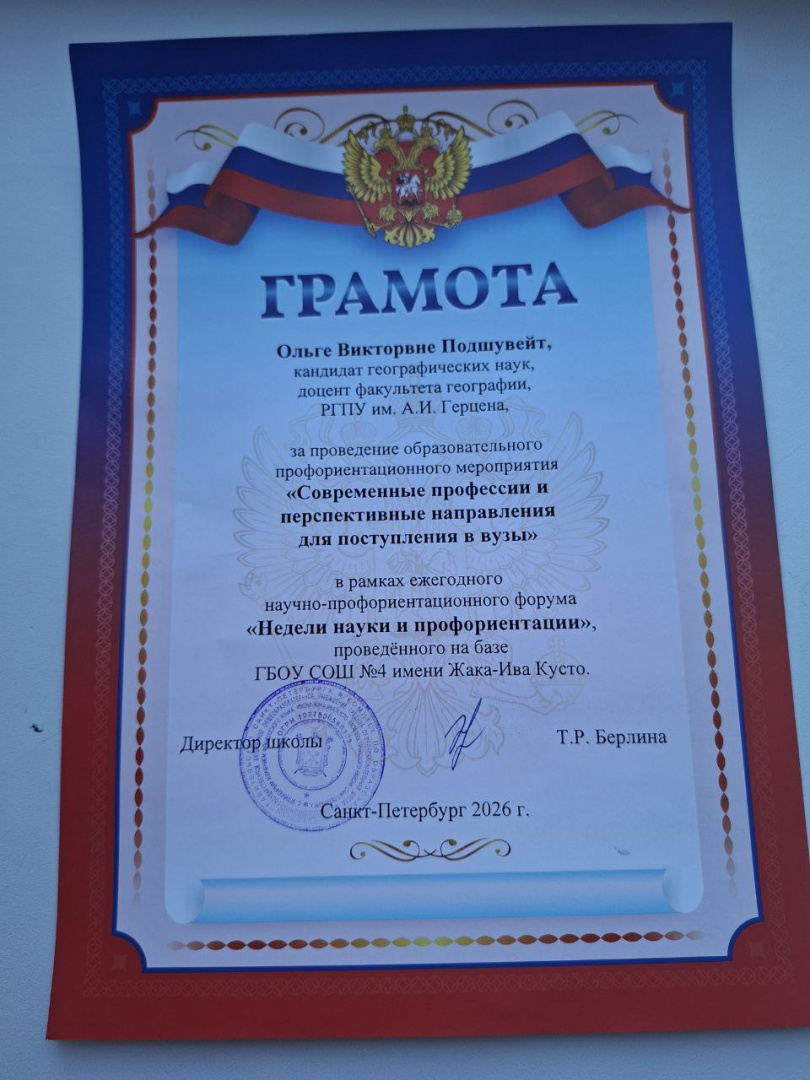 Доцент факультета географии РГПУ им. А. И. Герцена Ольга Подшувейт провела тематическую лекцию для учеников школы № 4 имени Жака-Ива Кусто о профессии географа и профильном образовании в Герценовском университете. Лекция состоялась в рамках научно-профориентационного форума «Недели науки и профориентации».