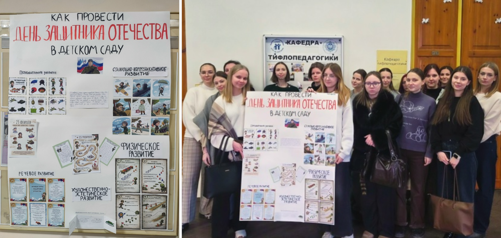 Мероприятие было приурочено к празднованию Дня защитника Отечества. Студенты работали над созданием информационно-методического плаката на тему: "Как провести День защитника Отечества в детском саду".