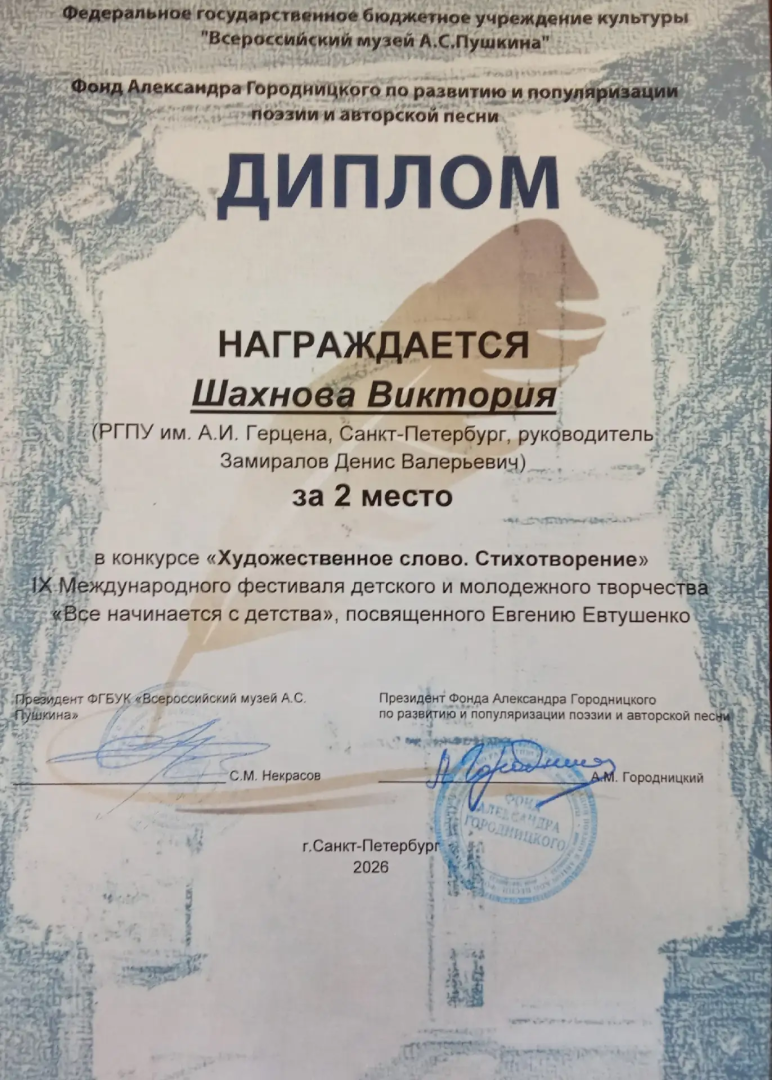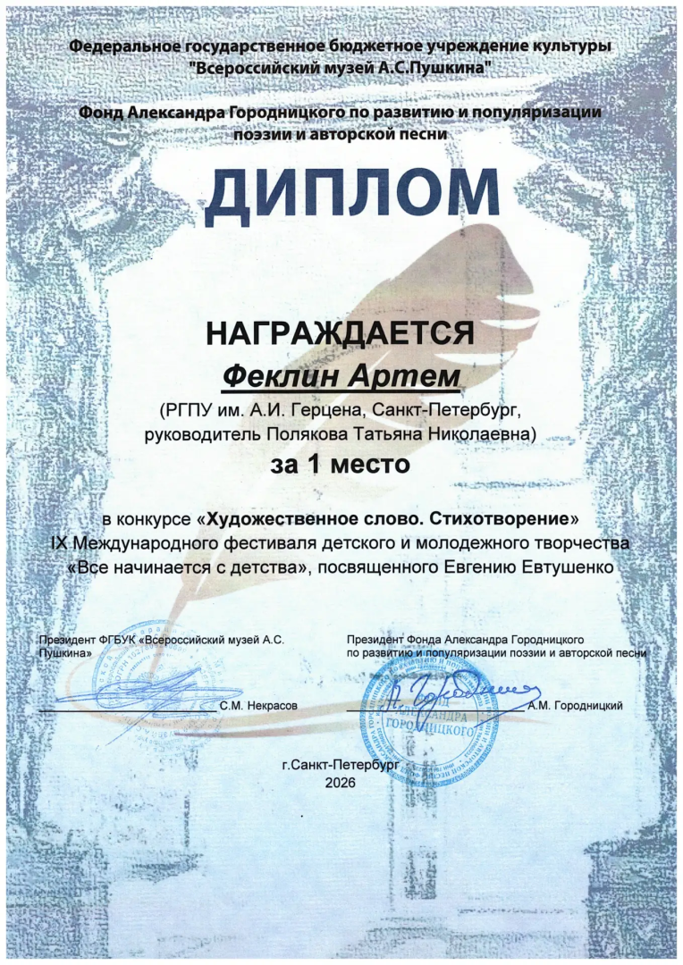В Санкт-Петербурге состоялся IX Международный фестиваль детского и молодежного творчества «Все начинается с детства», посвященный творчеству поэта Евгения Евтушенко. Конкурс прошел под эгидой Всероссийского музея А. С. Пушкина и фонда Александра Городницкого.