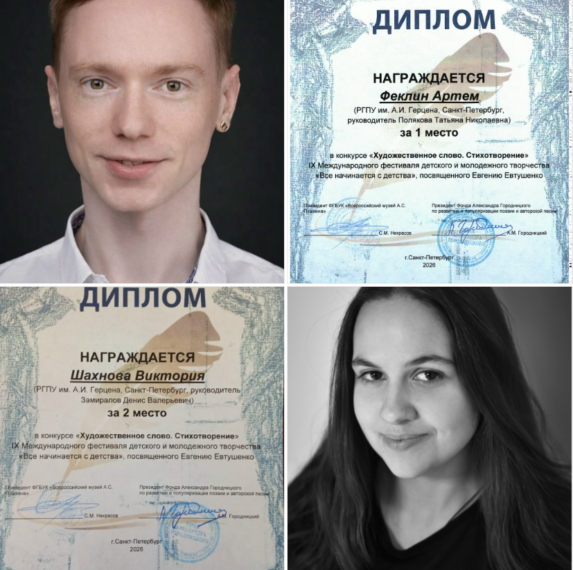 10 апреля состоялось торжественное награждение победителей конкурса, где отличились студенты магистратуры второго курса направления «Театральное образование». В номинации «Художественное слово. Стихотворение» победу одержал Артем Феклин, завоевавший первое место (руководитель Полякова Т. Н.). Второе место в этой же номинации заняла Виктория Шахнова (руководитель Замиралов Д. В.).