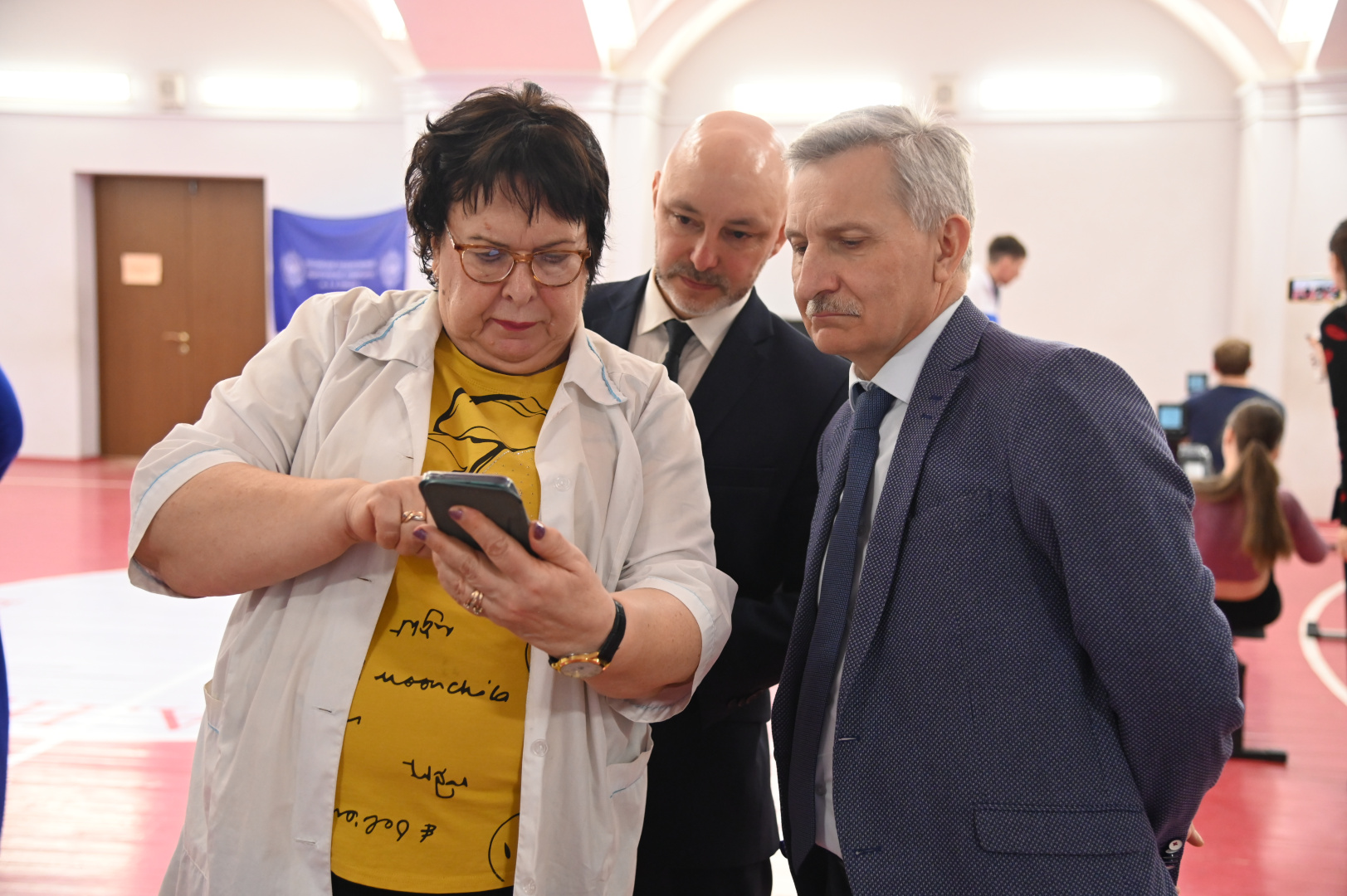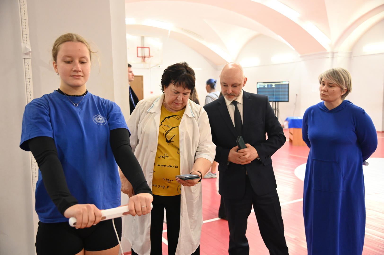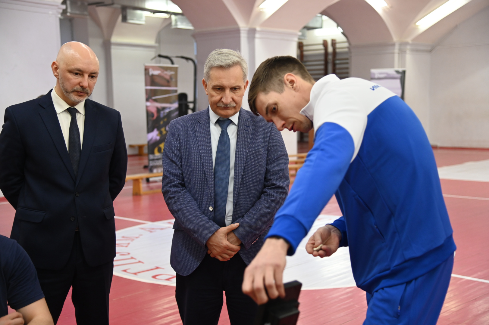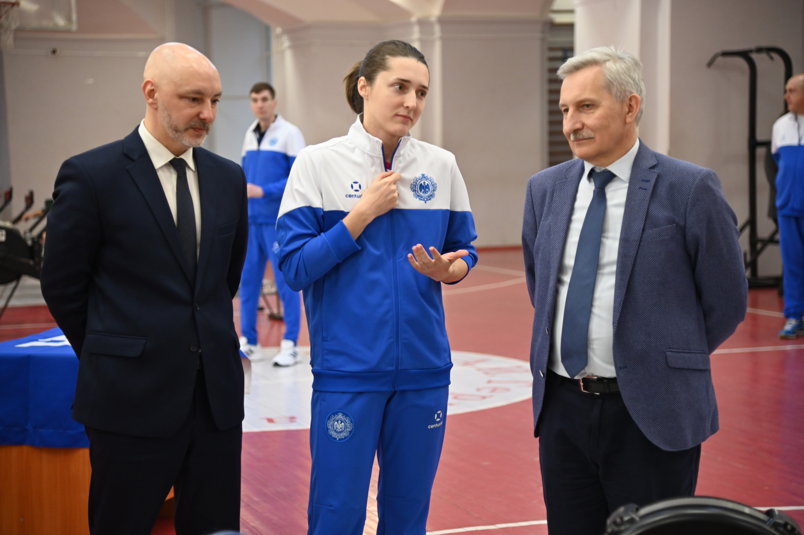 В спортивном зале состоялось знакомство с командой и тренерским составом, после чего прошла тренировка с кратким рассказом тренеров о подготовительной деятельности, включая визуализацию гоночного процесса и демонстрацию соревновательных элементов. Речь шла и о научно-исследовательской работе по измерению показателей сердечно-сосудистой системы до и после тренировки, а также биоимпедансного анализа состава тела (метод диагностики состава тела человека).