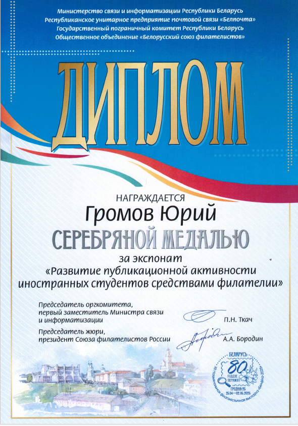 Образовательная площадка «Герценовский филателист» приняла участие в XII Национальной филателистической выставки «Белфила‒2025», посвященной 80-летию Победы советского народа в Великой Отечественной войне. Экспонат в литературном классе «Развитие публикационной активности иностранных студентов средствами филателии» был высоко оценен членами жюри и получил серебряную медаль.
