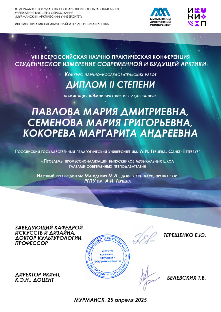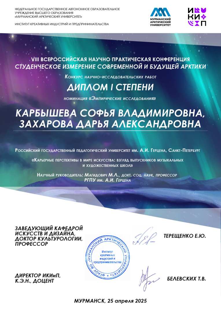 Студенты второго курса института философии человека РГПУ им. А. И. Герцена стали победителями всероссийского конкурса научных исследований. Свои доклады герценовцы, обучающиеся по профилю «Культурологическое образование» (модуль «Музейная и театральная педагогика»), под руководством профессора Марины Магидович представили на VIII Всероссийской научно-практической конференции «Студенческое измерение современной и будущей Арктики».