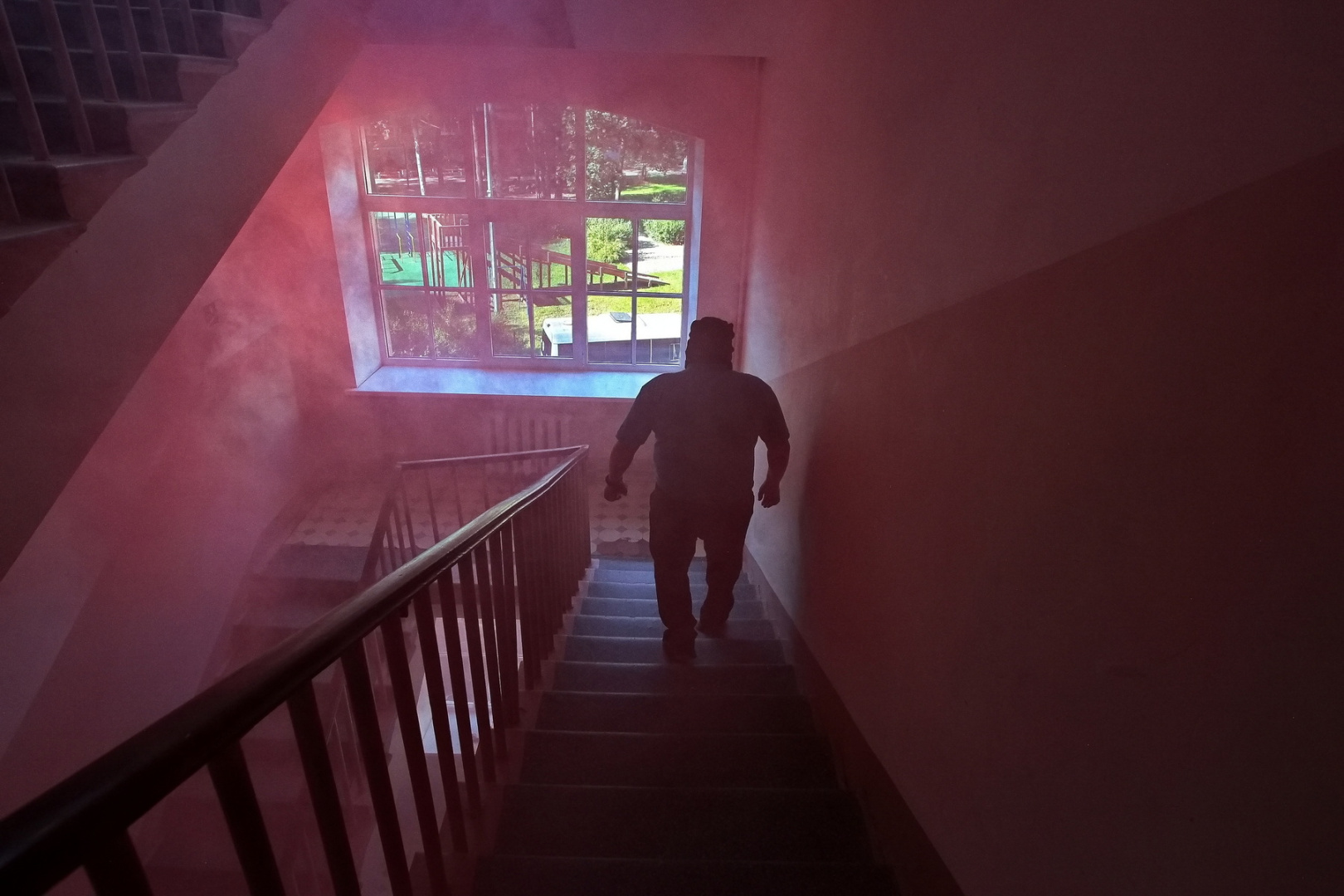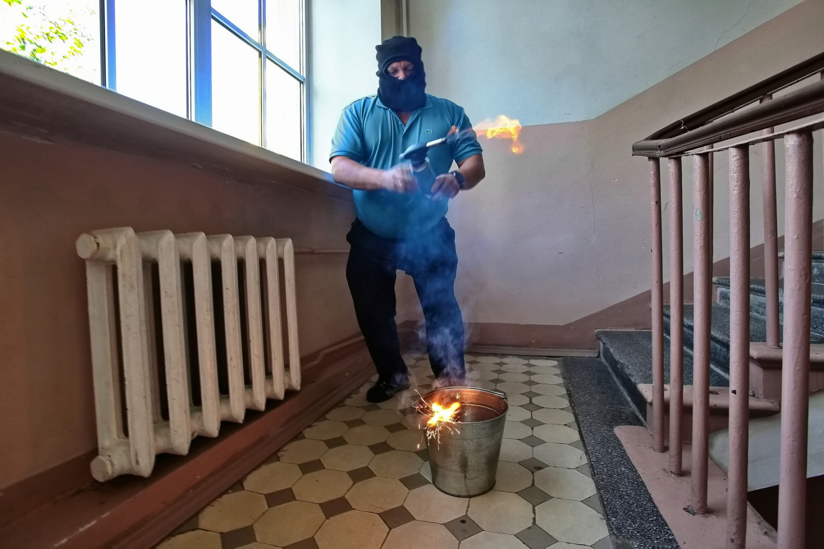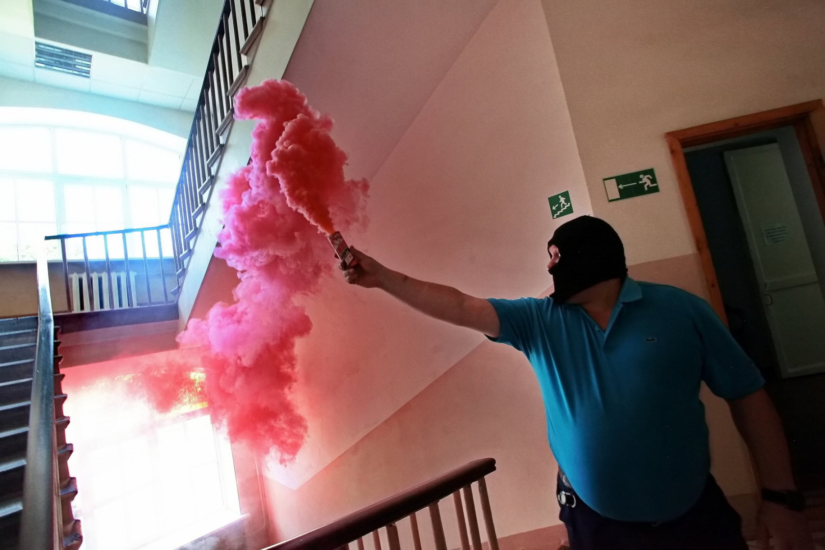 По замыслу учений на территорию института проникает вооруженный человек. Он поджигает лестницу, ведущую к эвакуационному выходу, и покидает здание через него. В это время охранник по микрофону системы оповещения транслирует сообщение о проникновении стрелка, поджоге лестницы и необходимости эвакуации людей в обход места возгорания. Администрация принимает меры по эвакуации, после чего проводит сбор эвакуированных в безопасной зоне и докладывает о результатах членам контрольной группы.