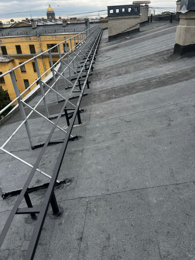 Кроме того, установлено металлическое ограждение, которое обеспечивает безопасность при эксплуатации крыши. Парапеты, свесы и брандмауэры теперь обеспечены защитным покрытием, чтобы предотвратить воздействие влаги на конструктивные элементы здания. Отдельным этапом работ стал монтаж металлоконструкций для установки кондиционерного оборудования, которое улучшит микроклимат в гостинице.