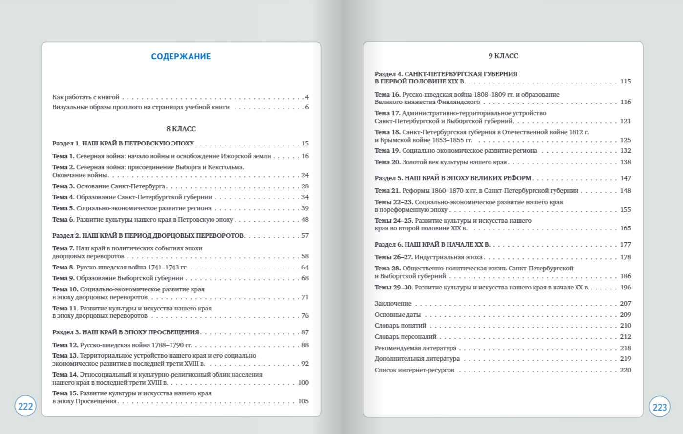 Как отмечают авторы, пособие раскрывает особенности истории и культуры Ленинградской области: «Оно включает авторский текст, служащий ориентиром для изучения исторических событий, систему вопросов и заданий, способствующих самостоятельной учебной деятельности учащихся. Богатый иллюстративный материал является частью методического аппарата, содержит исторические карты, старинные и современные фотографии, картины известных художников, рисунки и схемы, что поможет школьникам в усвоении и закреплении полученных знаний». Также представлены рекомендации по организации учебной деятельности и памятки, список основных дат, словарь понятий и персоналий, список рекомендуемой и дополнительной литературы.