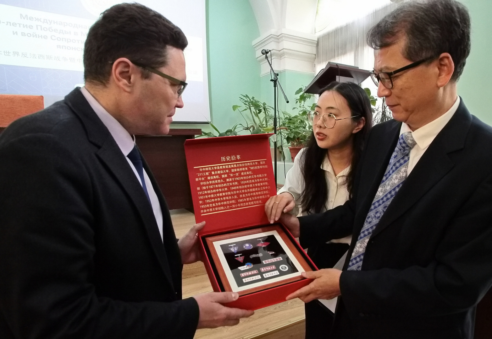 С докладами выступили представители Герценовского университета и вузов Китая. Директор института востоковедения РГПУ им. А. И. Герцена Андрей Вассоевич представил доклад о решающем вкладе народов Советского Союза и Китая в Победу над японским милитаризмом. «Российская наука все чаще склоняется от западноевропейской хронологии событий Второй мировой войны к китайской хронологии. Многие выдающиеся ученые придерживались мнения, что датой начала войны следует считать 7 июля 1937 года, когда японские войска вторглись в Китай. Сейчас эту точку зрения разделяют все больше исследователей. Хронология, родившаяся в Китае, отличается логической стройностью. Более того, она заставляет помнить о тех жертвах, которые принес не только китайский народ, но и Красная армия, помогавшая в освобождении Китая от милитаристской Японии. На мой взгляд, сейчас, в год 80-летия Победы наших народов над силами фашизма, произойдет сближение позиций китайских и российских историков», — пояснил Андрей Вассоевич.
