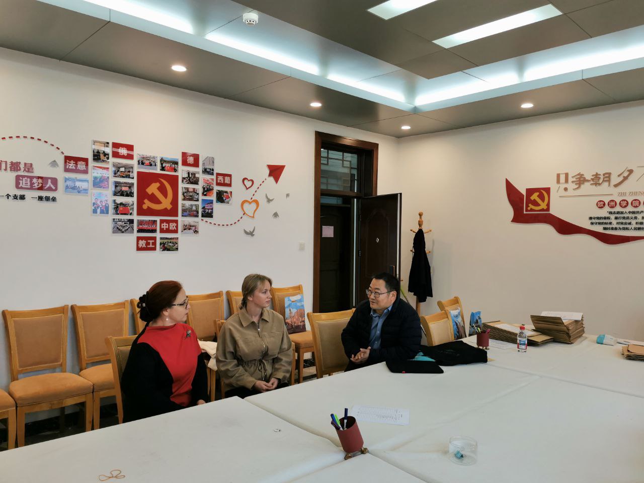 Российских специалистов, прибывших в зарубежный вуз, встретили декан Школы европейских языков, профессор Цзян Лу и заместитель декана профессор Сю Чуаньхуа.