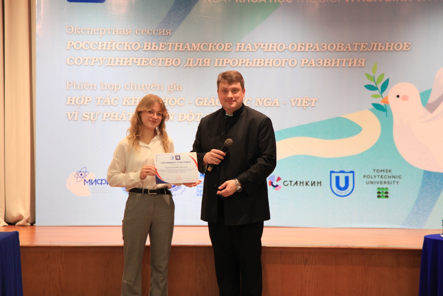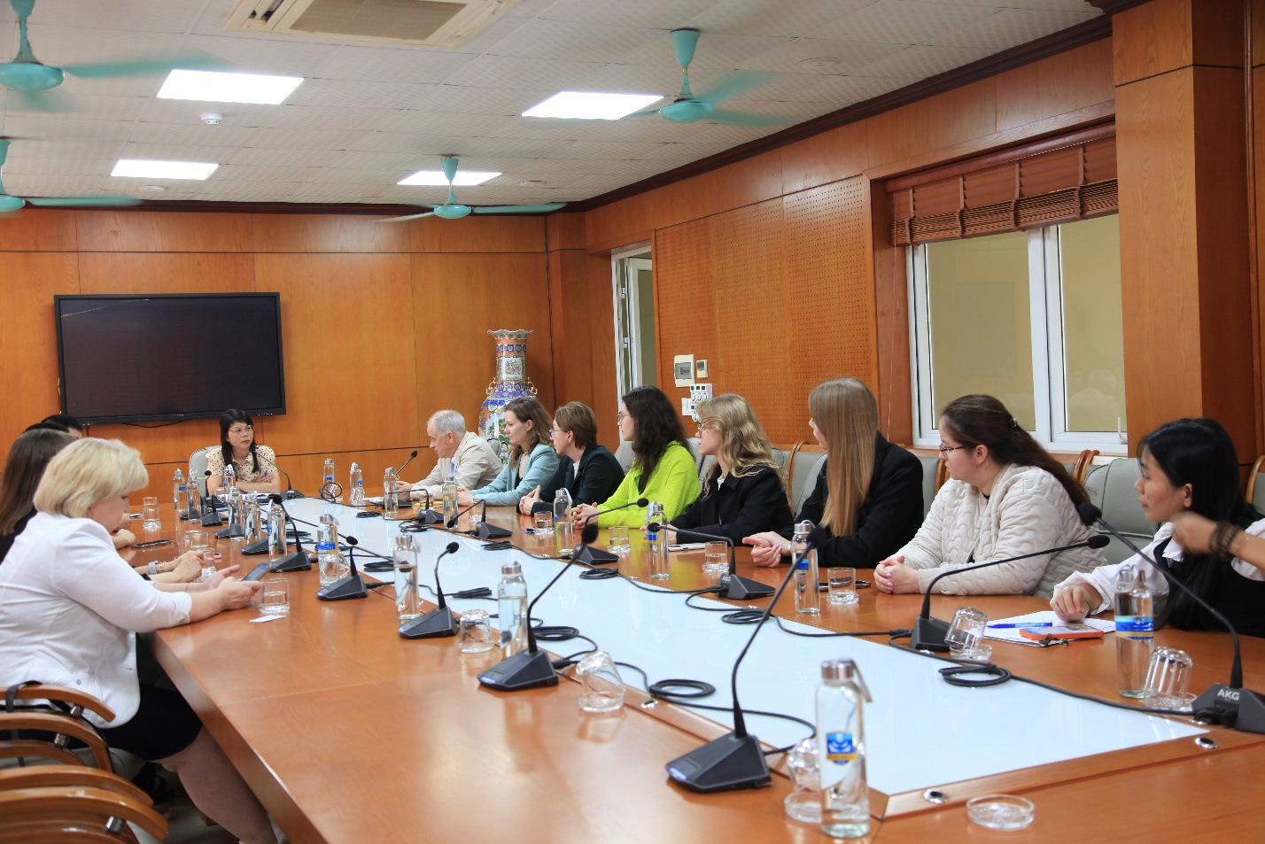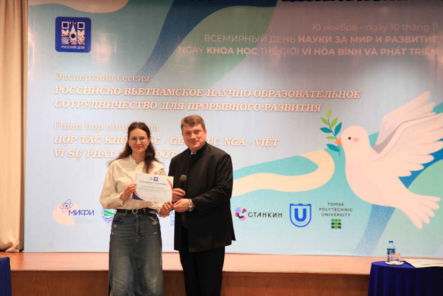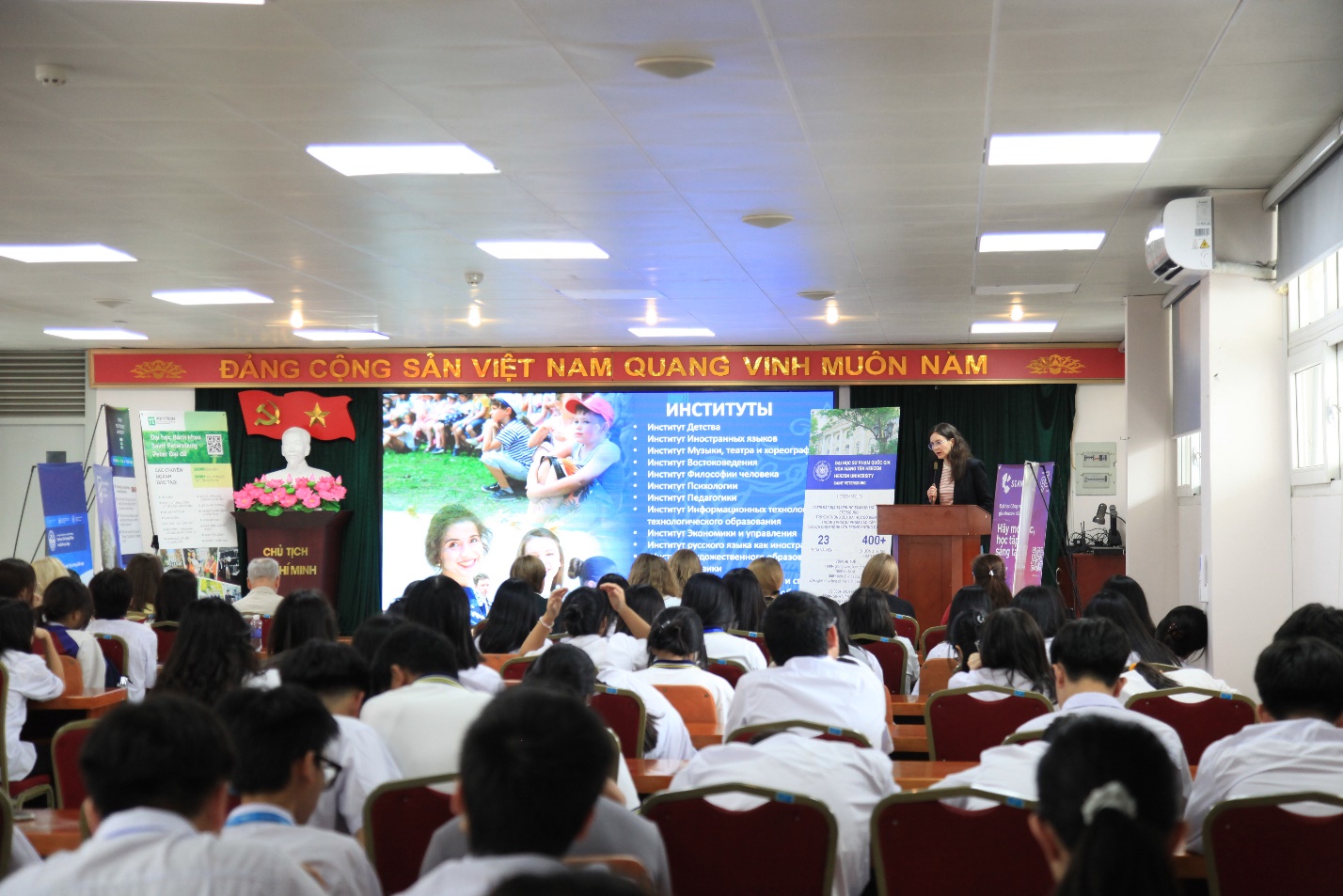 Заключительным мероприятием образовательной выставки стала традиционная встреча делегаций российских вузов с представителями научно-образовательного экспертного сообщества Вьетнама и СМИ. С докладом на тему: «Центры открытого образования на русском языке и обучения русскому языку РГПУ им. А. И. Герцена как эффективный инструмент продвижения русского языка и российского образования во Вьетнаме» выступила ведущий специалист отдела международных проектов Ксения Панова.