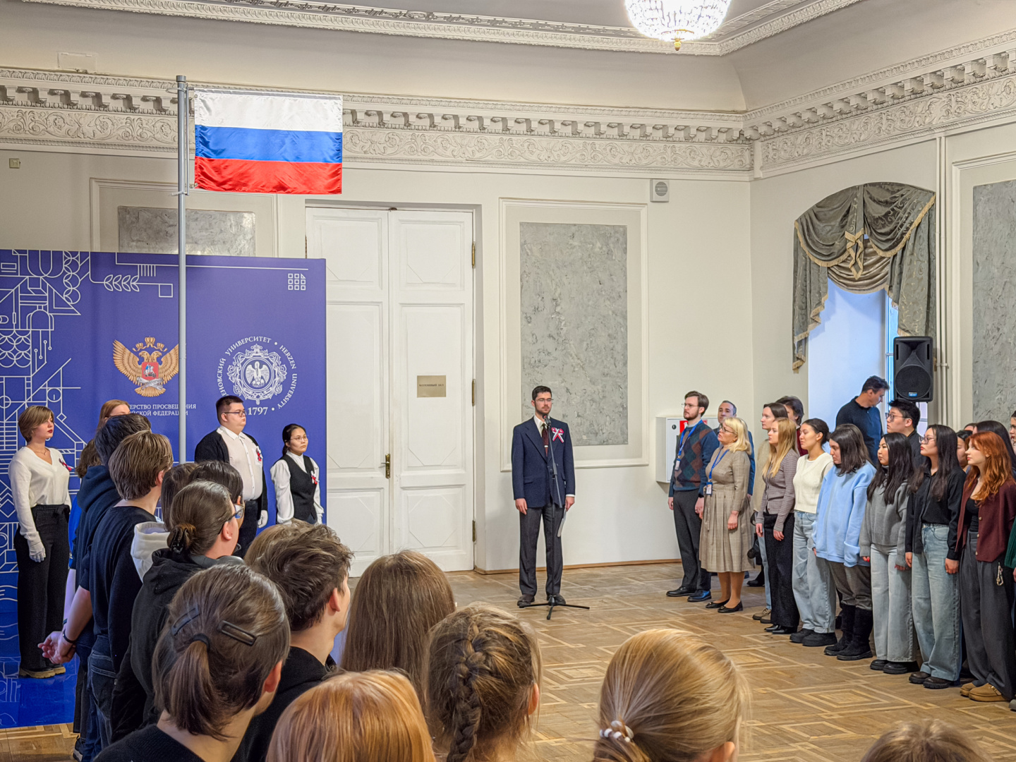 Почетное право поднять государственный флаг РФ было предоставлено лучшим студентам, проявившим себя в учебе, науке и общественной жизни. Ими стали студентка 1 курса института народов Севера, член Санкт-Петербургского Ямальского землячества ассоциации «Ямал-Потомкам!», победитель 12-го Всероссийского слета юных полярников «Наша Планета — 2025» Лидия Салиндер, студентка 4 курса института педагогики, руководитель Герценовского игрового клуба, организатор интеллектуальной викторины, посвященной 80-летию Победы в Великой Отечественной войне Евгения Степанович, студентка 3 курса института физики, боец студенческого отряда проводников «Романтик», член студенческого совета, участник Санкт-Петербургского международного научно-образовательного салона и Двенадцатого Евразийского молодежного инновационного конвента Людмила Титова и студент 3 курса факультета химии, обладатель благодарности за участие в организации и проведении Санкт-Петербургского фестиваля научных театров «Наука всем!» и диплома за лучший стендовый доклад на фестивале Ярослав Григорьевский.