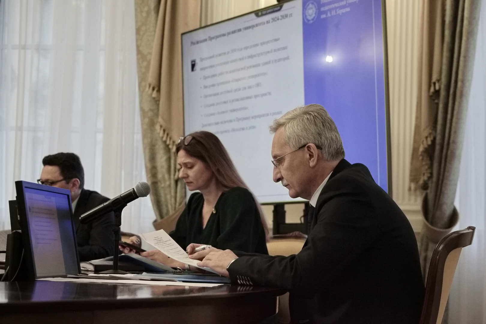 О ходе реализации Программы развития университета до 2030 года рассказал проректор по имущественному комплексу Василий Осипов. В 2025 году завершился ремонт фасада корпуса № 7, выходящего на Казанскую улицу, и фасадов корпусов № 9 и № 10, благоустроена площадь Инициативных. В планах — обновление кровли и фасада корпуса № 8 и начало фасадных работ в главном корпусе № 5, ремонт внутреннего фасада корпуса № 7. В программу дополнительно включены мероприятия национального проекта «Молодежь и дети». Они предполагают ремонт ряда аудиторий в учебных корпусах на Вознесенском проспекте, д. 39, в переулке Каховского, д. 2, а также двух аудиторий в 6-м корпусе, восьми аудиторий и досугового пространства в холле третьего этажа 1-го корпуса на набережной реки Мойки.