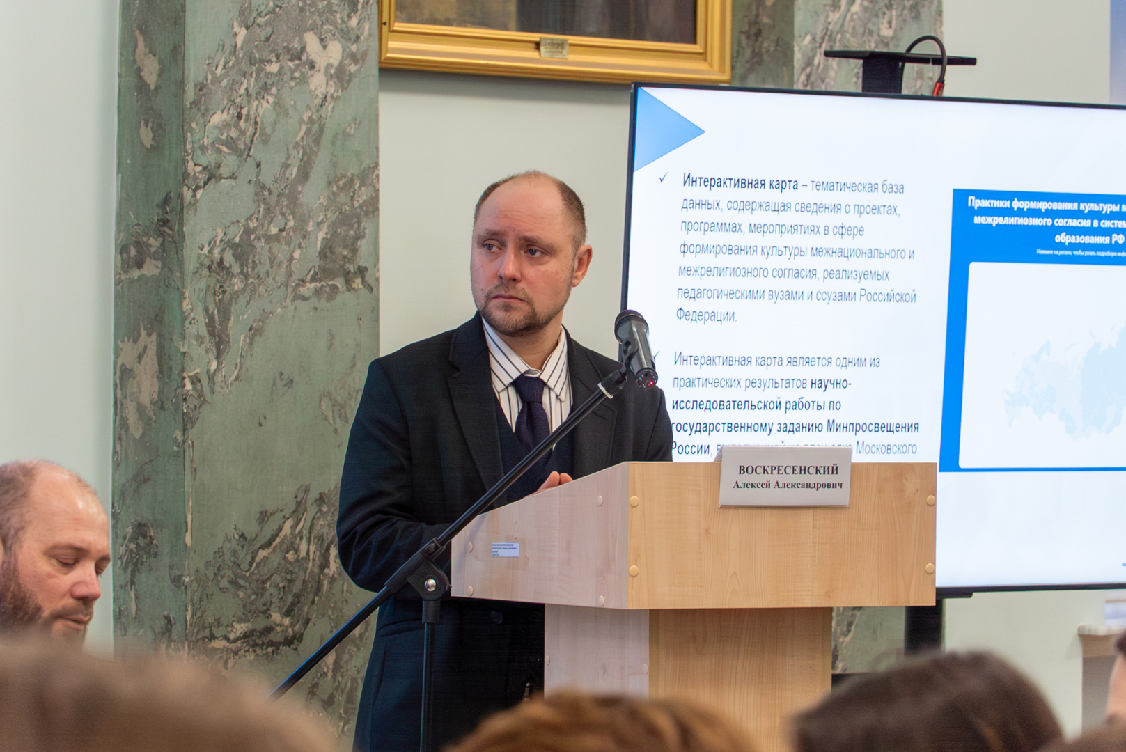 Ведущий специалист управления социологических и статистических исследований ВНМЦ «Философия образования» МПГУ, директор института гуманитарных технологий и социального инжиниринга Финансового университета при Правительстве РФ Елена Бродовская представила результаты исследования, который может помочь Минпросвещения России и региональным органам в мониторинге, анализе, планировании и координации государственной политики, в трансляции и масштабировании лучших практик работы с молодежью. Речь идет об интерактивной карте практик формирования культуры межнационального и межрелигиозного согласия в системе педагогического образования России.