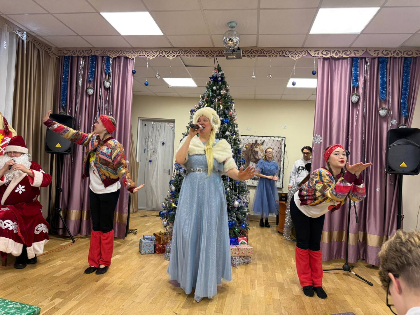 Праздничную атмосферу для детей создали ведущие мероприятия — руководитель студии «Рок-лаборатория» Студенческого дворца культуры Ольга Никиточкина и заместитель директора по воспитательной работе института физики Александр Жаркой, которые выступили в образах Снегурочки и Деда Мороза. Для ребят была подготовлена творческая программа с любимыми с детства новогодними песнями.