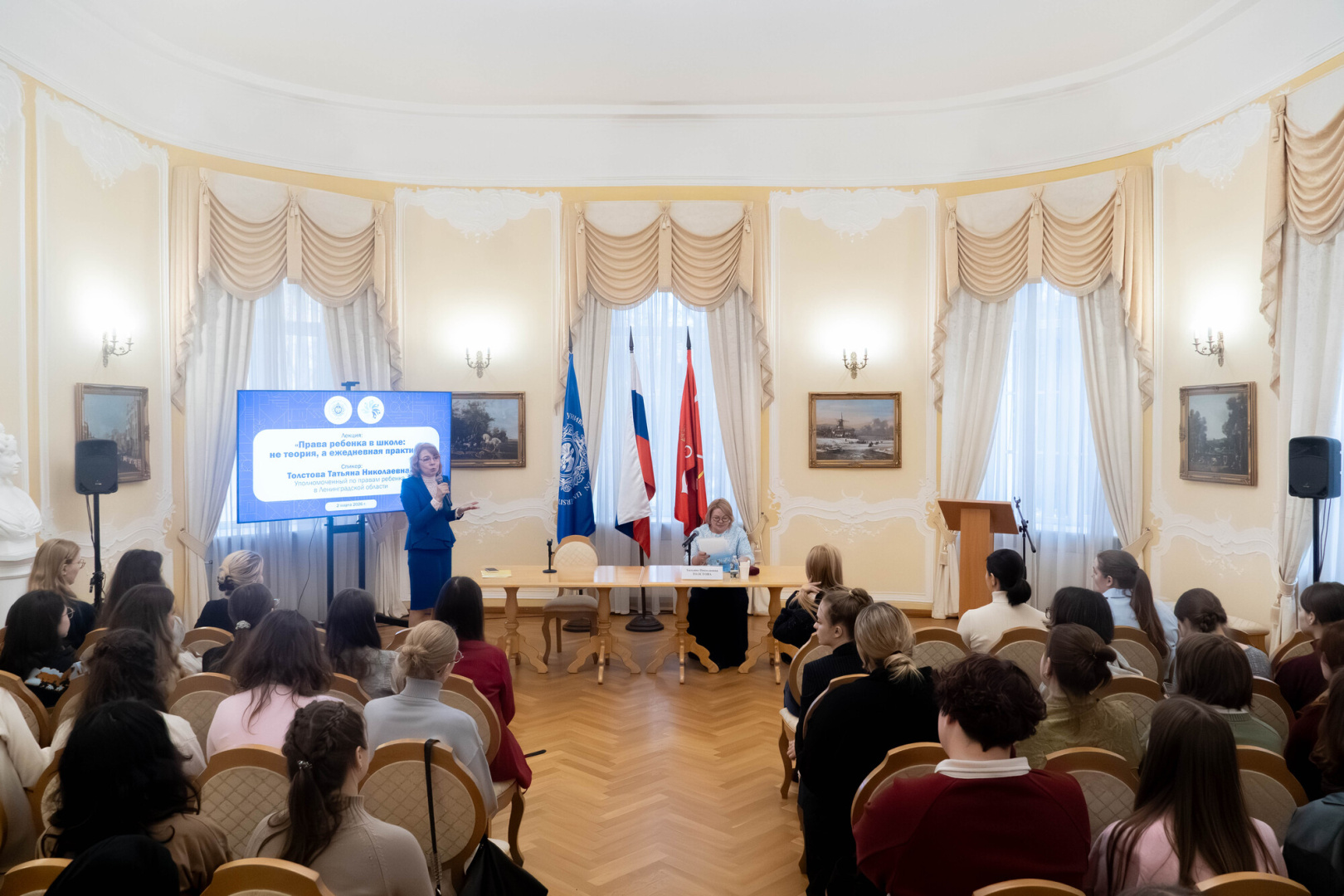 Уполномоченный по правам ребенка в Ленинградской области, выпускница РГПУ им. А. И. Герцена Татьяна Толстова провела в вузе открытую лекцию для педагогов «Права ребенка в школе: не теория, а ежедневная практика». Эксперт рассказала, как учитель может обезопасить себя и детей в обычной жизни и в школьной среде, и разъяснила нормы российских и международных законов о правах ребенка. Лекция стала частью программы повышения квалификации «Навыки учителя современной школы», которая проводится в рамках герценовского проекта «Команда школьных педагогов «под ключ».