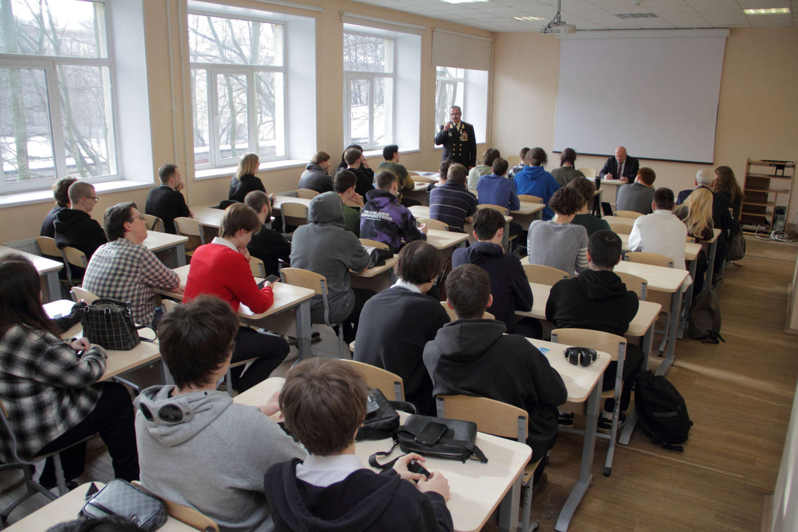 Доцент кафедры методики обучения безопасности и защите Родины Арсений Бойков познакомил герценовцев с симулятором управления БПЛА. Полет дрона на практике показал участник СВО, студент факультета комплексной безопасности и военно-патриотического воспитания Артем (фамилии не разглашаются по соображениям безопасности). В зоне боевых действий он начинал как оператор БПЛА и дослужился до начальника расчета.