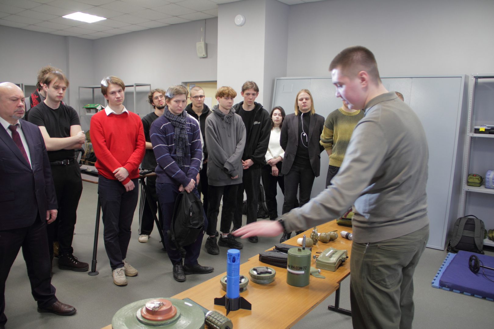 Практические занятия по беспилотникам проводятся в сочетании с общей военной подготовкой. Участник боевых действий, сейчас студент факультета комплексной безопасности и военно-патриотического воспитания Арсений на мастер-классах обучает стрелковому и минно-саперному вооружению. «Я разъясняю устройство пистолета Макарова, мин-«лепестков», других видов саперного вооружения, используемых в регулярной армии. Эти знания необходимы не только военнослужащим, но и гражданским лицам, поскольку человек может в любой момент столкнуться с оружием», — отметил Арсений.