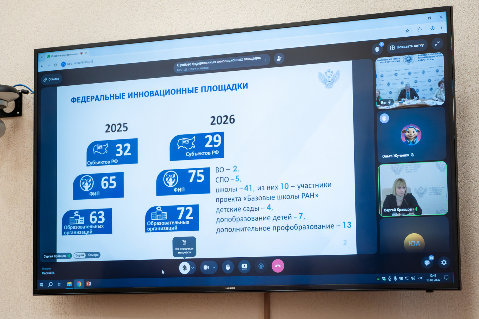 Сергей Кравцов поддержал инициативы и отметил, что сегодня федеральные инновационные площадки выступают базой для экспериментального апробирования передовых педагогических практик, которые затем могут быть масштабированы на все уровни образовательного процесса. Для их дальнейшего совершенствования необходимо привести деятельность ФИПов в соответствие с утвержденными направлениями исследовательской работы. Дополнительно Сергей Кравцов обозначил сферы, где следует усилить работу площадок, включая участие в проекте «Без срока давности», взаимодействие с образовательным центром «Сириус», разработку проектов в области музейной и кинопедагогики.