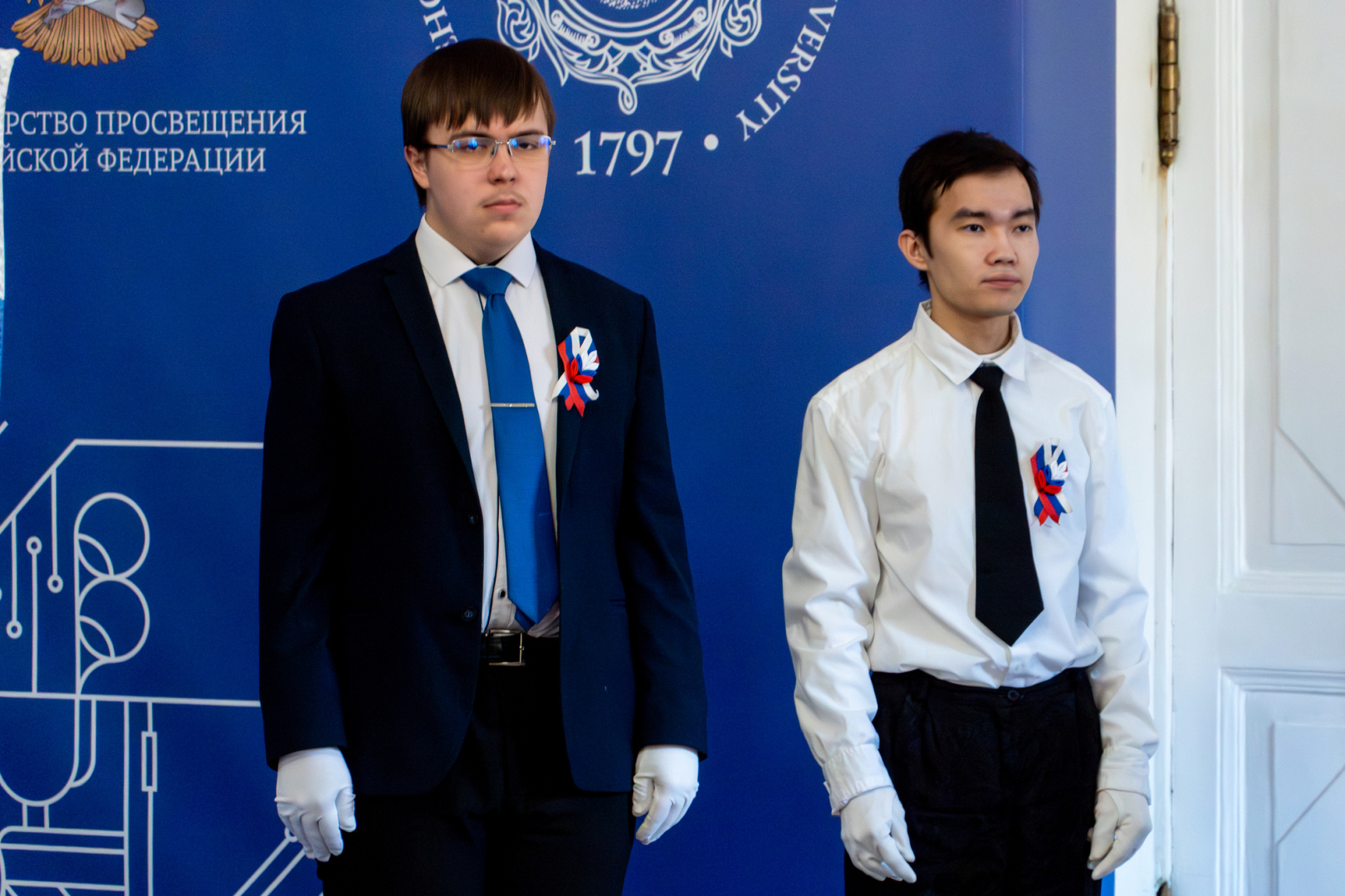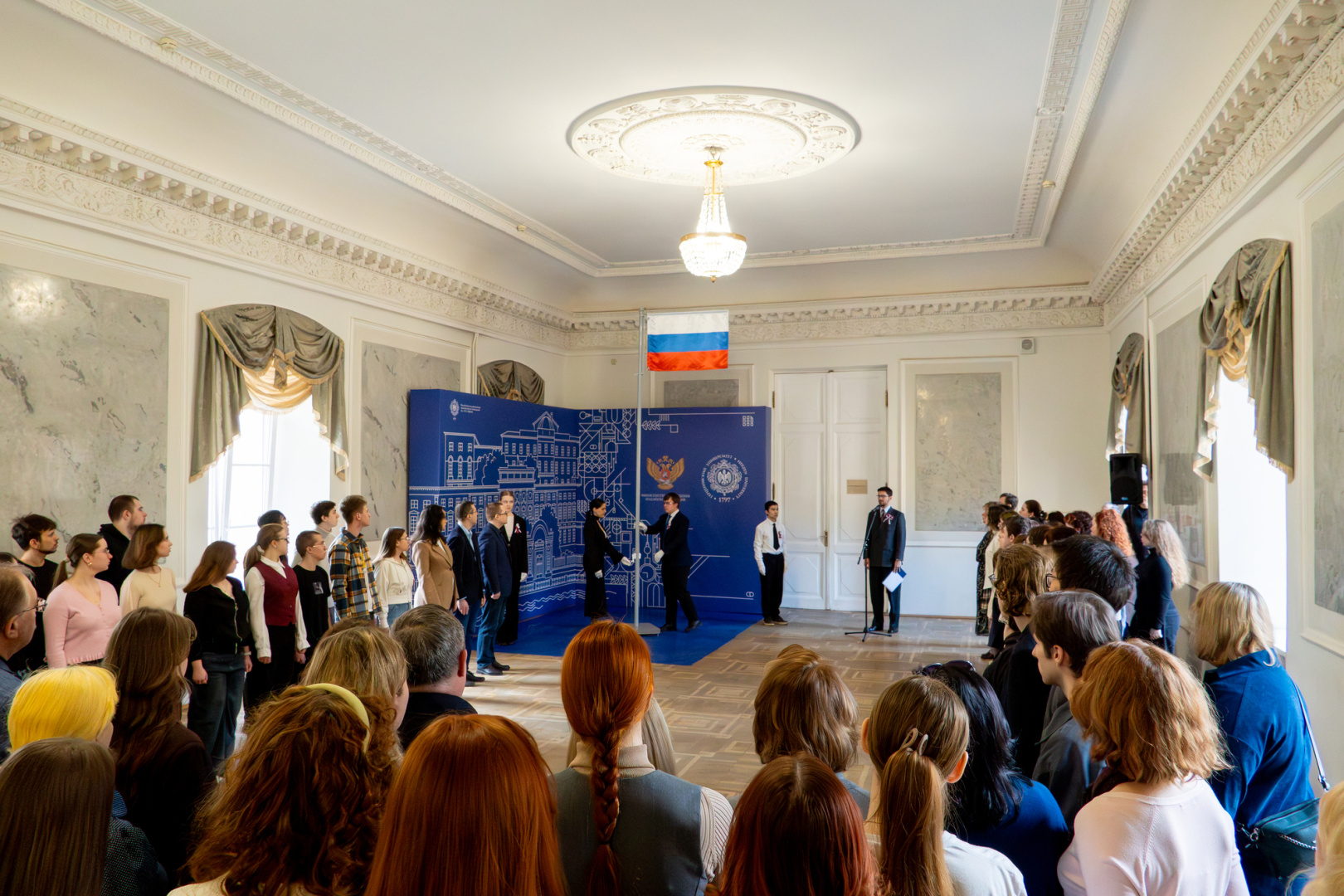Ведущий церемонии, сотрудник Студенческого дворца культуры Николай Яковлев представил студентов, удостоенных права поднять флаг на этой неделе. Ими стали отличники учебы, активисты и волонтеры: студентка факультета комплексной безопасности и военно-патриотического воспитания, лауреат ежегодного педагогического конкурса «Учитель, которого ждут» Центрального района Санкт-Петербурга, дважды золотой медалист ГТО, активный волонтер Лейла Турабова; студент института истории и социальных наук, активный участник мероприятий Юношеского клуба общественных наук Санкт-Петербургского городского Дворца творчества юных, автор исторического лектория для детей, участник выездов в загородный центр «Зеркальный» в качестве вожатого Денис Семенский; студентка института психологии, глава культурно-массового отдела студенческого совета института, старший куратор академической группы первокурсников, волонтер Международной научно-практической конференции «Герценовские чтения: психологические исследования в образовании», организатор тренинга «Как справляться с тревожностью» для юридического факультета вуза Анастасия Рогова; студент института детства, активный член студенческого совета института, участник творческого фольклорного коллектива обских угров «Увас Хус», обладатель в составе коллектива Гран-при IX Открытого регионального молодежного фестиваля национальных культур «В кругу друзей» по направлению «Аутентичный фольклор» Никита Ребась.